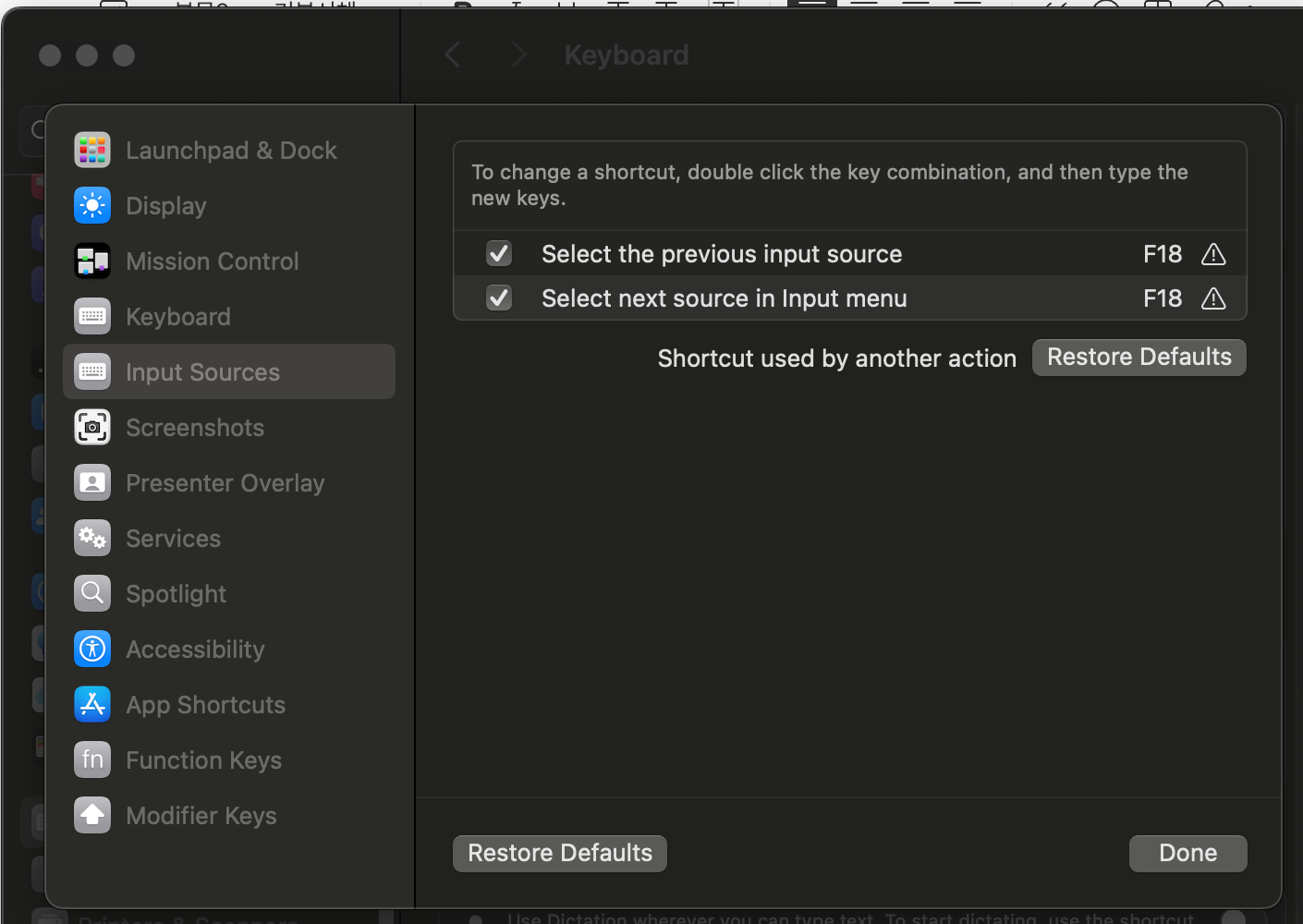 한영 단축키 설정은 먼서 설정 > 키보드 > 단축키 설정 (Keyboard Shortcuts) > 입력 소스 (Input Sources)를 선택합니다. 그리고 다음과 같이 두개의 옵션을 모두 F18로 변경해줍니다. 그러면 우측 ALT 키를 한영 전환 키로 사용할 수 있습니다.