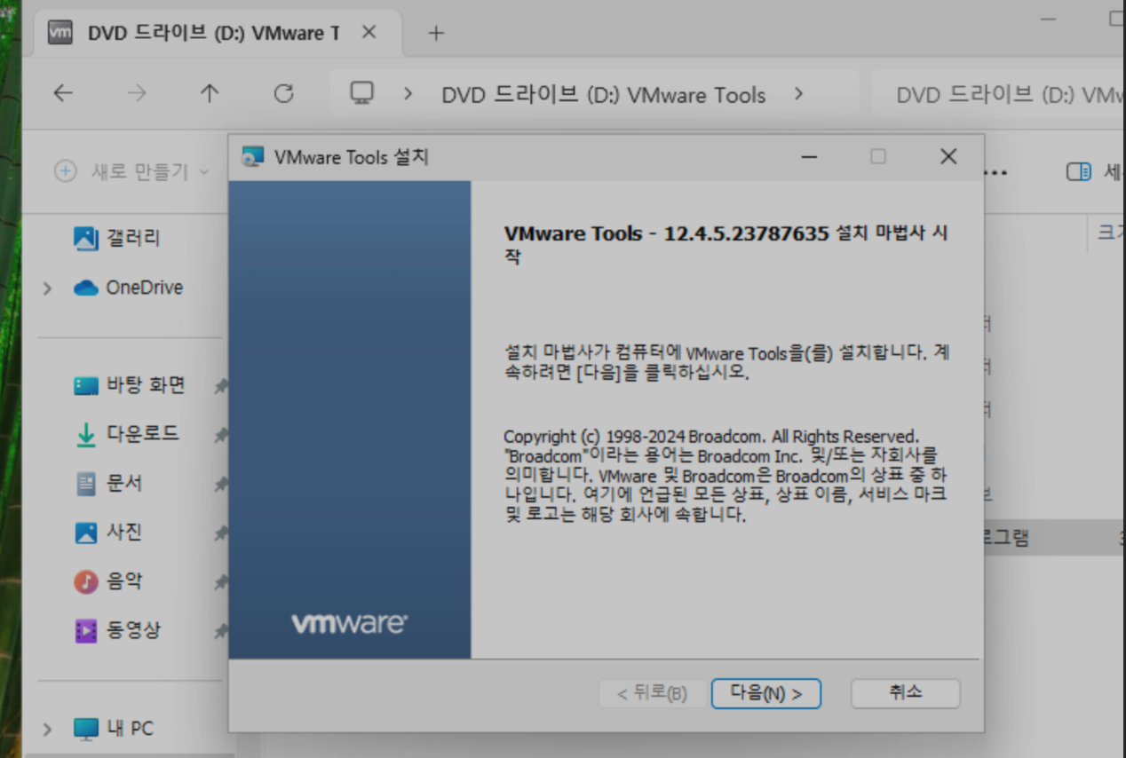그러면 윈도우에서 다음과 같이 새로운 vmware tools가 담긴 CD가 인식되어집니다. 여기서 setup을 실행하여 설치를 마침니다.