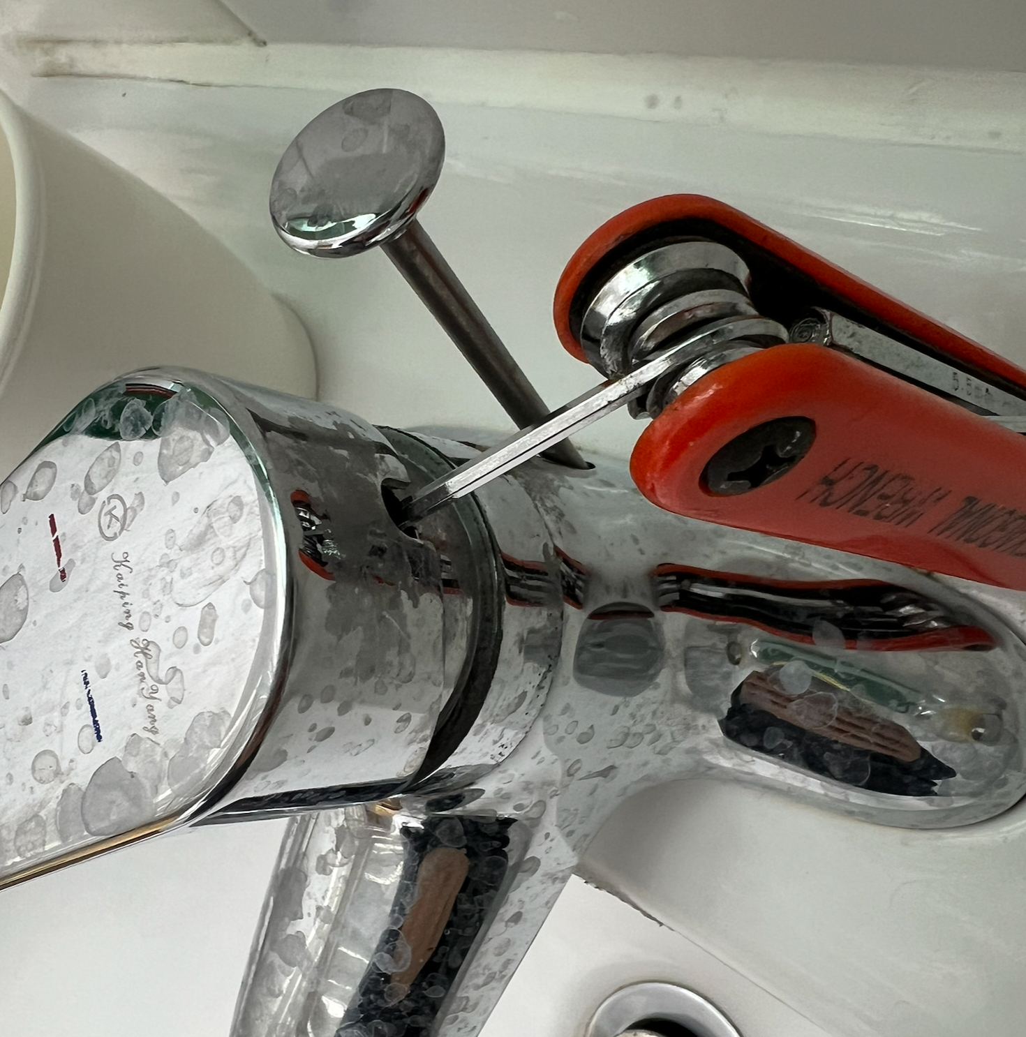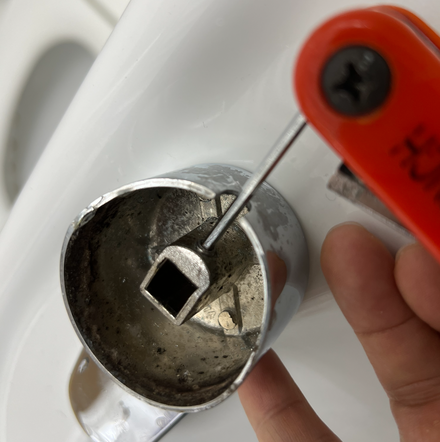 수전되에 렌치를 삽입한 모습니다. 뭐가 제대로 꼽히는 느낌이 들면 렌치를 돌려서 (시계반대방향) 나사를 풀어줍니다.