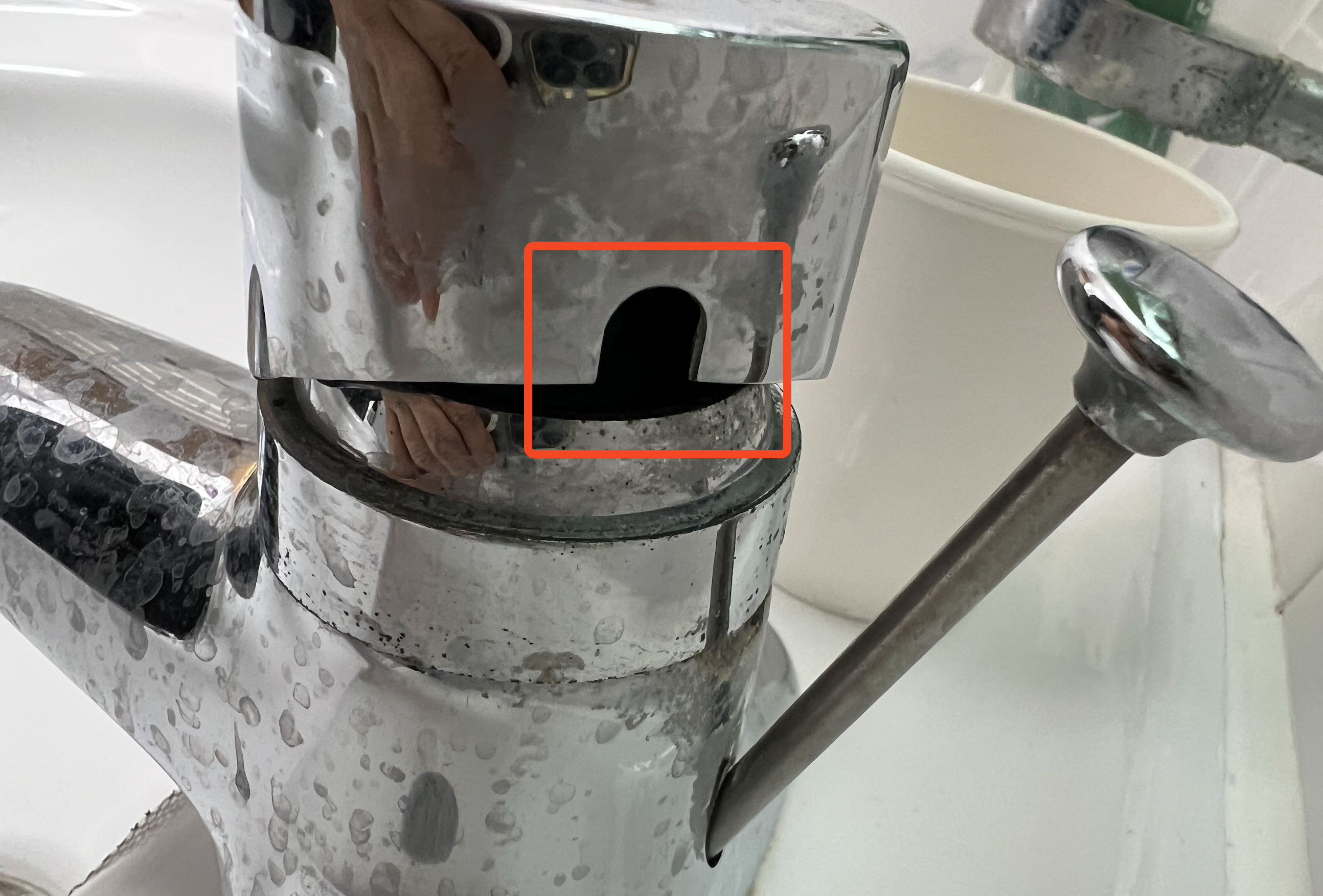 두번째로 수도꼭지의 뒷면을 살펴보시면 육각 렌치를 꼽아서 돌릴 수 있는 구멍이 보입니다. 잘 보이지는 않을 수 있지만 아래의 사진과 같은 구멍을 쉽게 찾으실 수 있을겁니다. 구멍에 육각 렌치를 넣고 더듬더듬 렌치가 딱 꼽히는 위치를 찾으셔야합니다. 의외로 잘 찾아집니다.